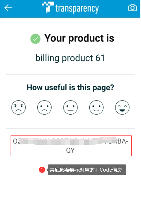 Transparency APP扫描后,正常的T-Code扫描效果如下:顶部为商品标题、图片;中间会展示商品相关的描述信息;最底部则会展示对应的T-Code码。(此截图为测试数据,缺少内容展示,具体以客户实际效果为准)