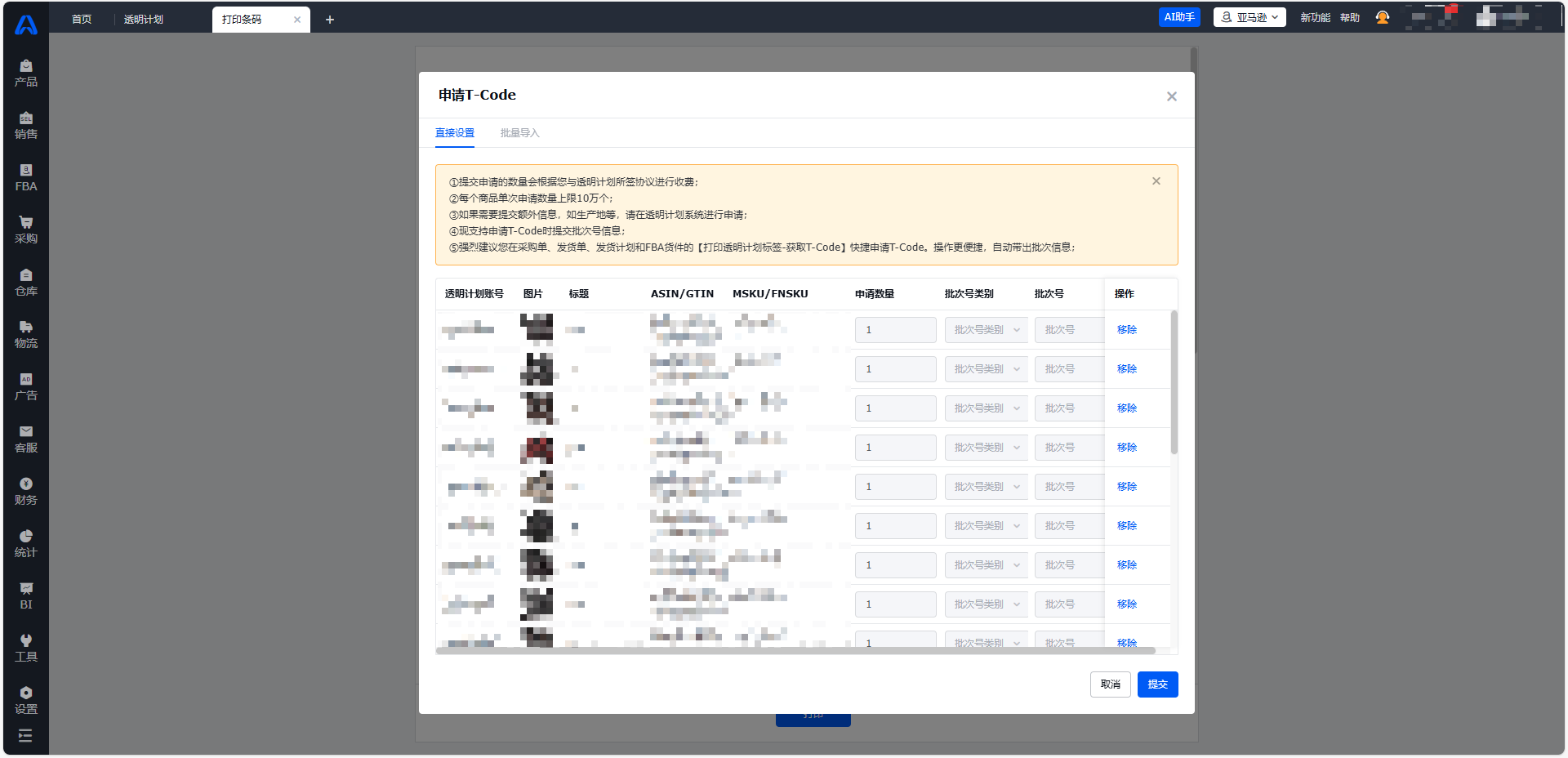 注意:当填写的批次号类别是采购单号、发货计划号、发货单号、FBA货件号时,强烈建议您在采购单、发货计划、发货单和FBA货件的【打印透明计划标签-获取T-Code】进行打印,无需提前申请T-Code。详见【四、4&5】。