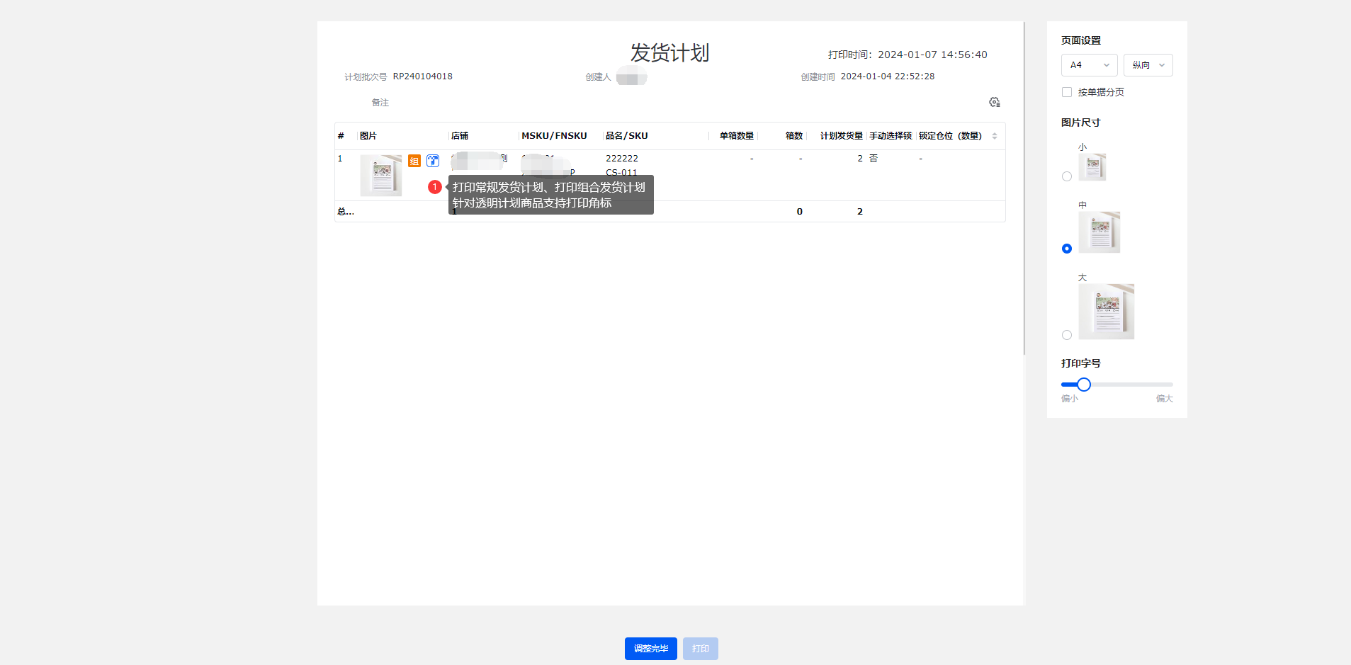 以下打印方式支持显示透明计划角标:打印常规发货计划、打印组合发货计划、打印常规发货单、打印组合发货单