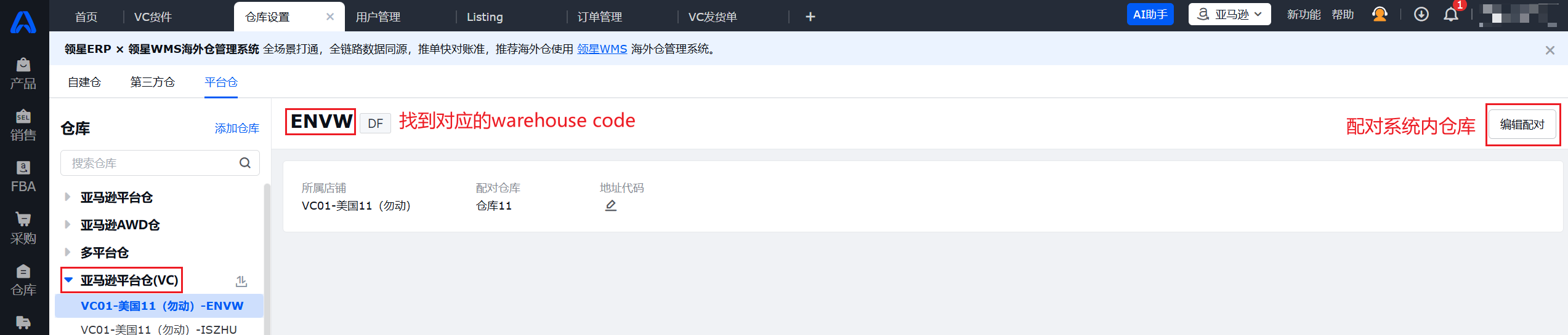 设置-仓库设置-平台仓-亚马逊平台仓(VC)