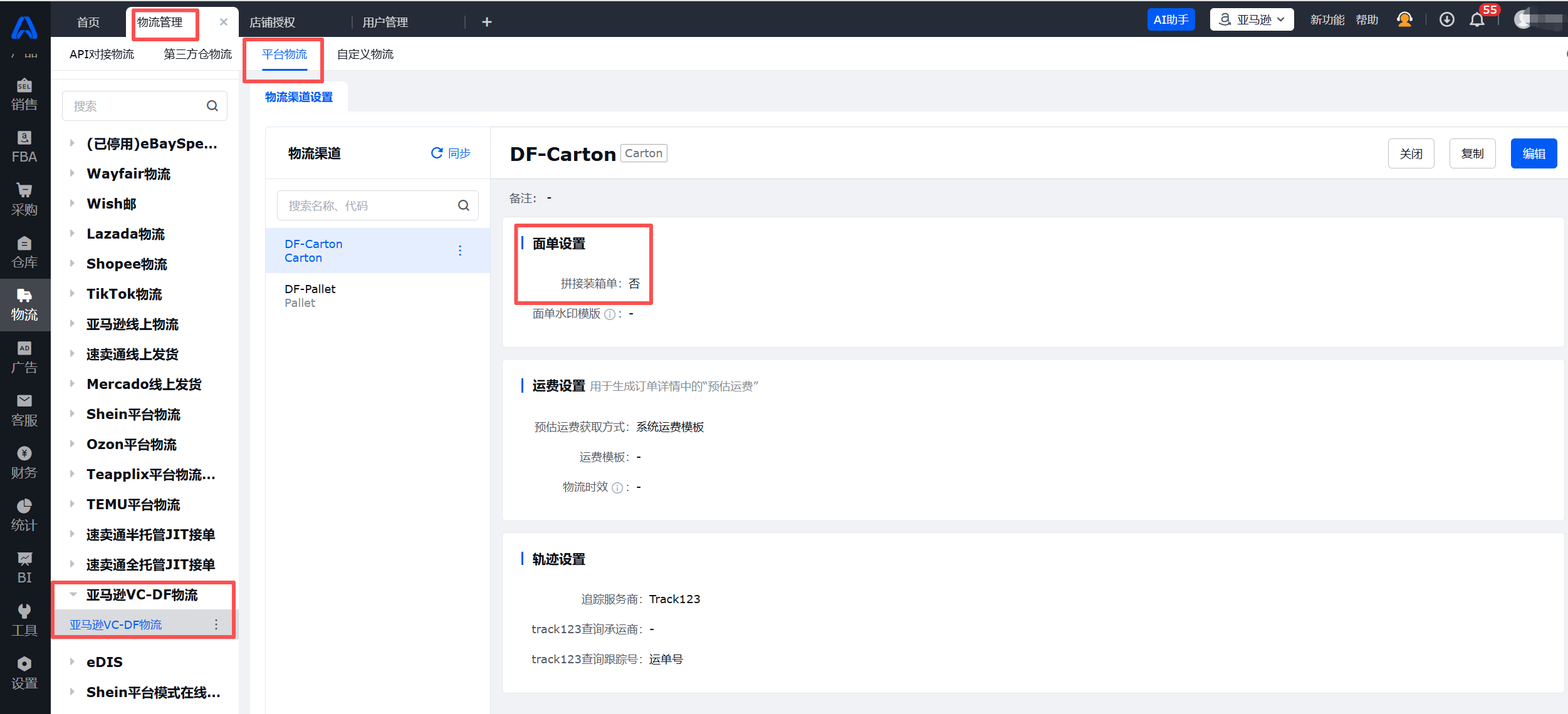 物流-物流管理-平台物流中点击添加,选择亚马逊VC-DF物流,自定义名称后添加,添加后对应启用渠道,Pallet对应托盘、Carton对应纸箱。