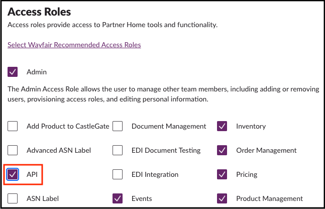 如果您登录wayfair新开发门户发现没有上述对应功能和选项页面,请检查您的PH账号的API权限已经勾选。导航至PH后台的Partner Home下User Management完成操作。