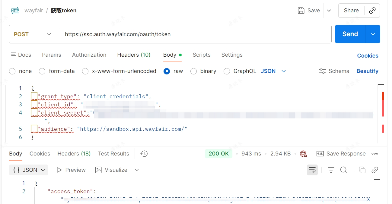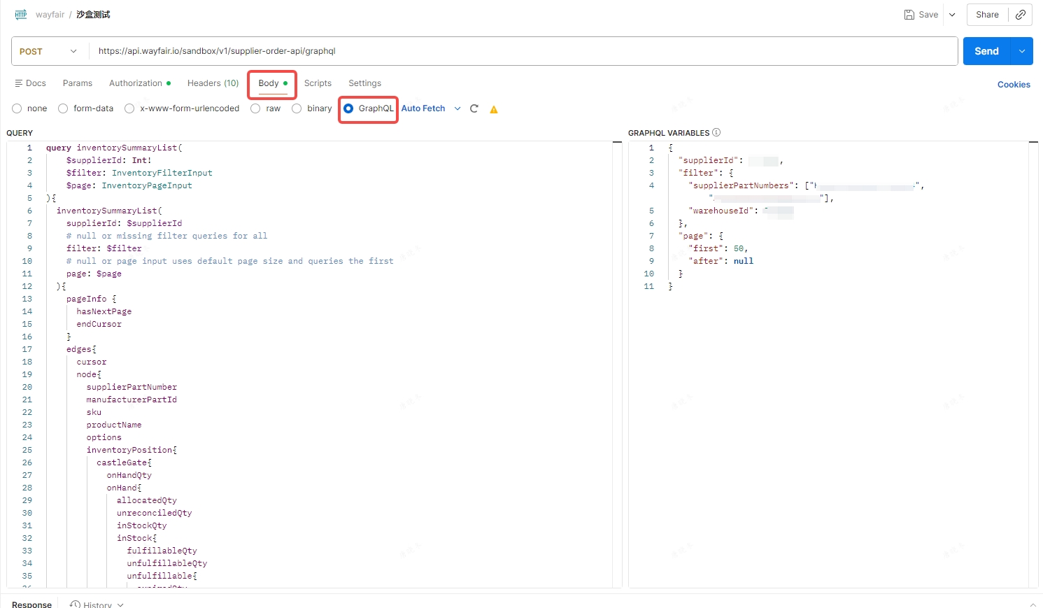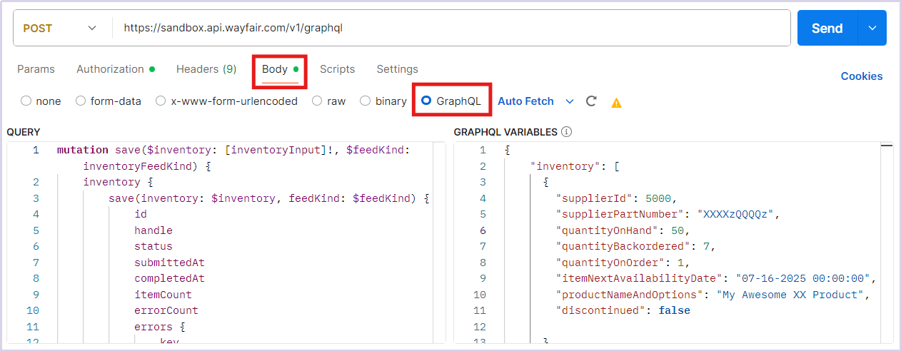 ③选择 Body 页面 (此文举例自发货库存同步API;CG仓库存API的请求数据格式及参数 见https://developer.wayfair.io/posts/docs/inventory-visibility-onhand-api/reference/GraphQL/v1.0.0)