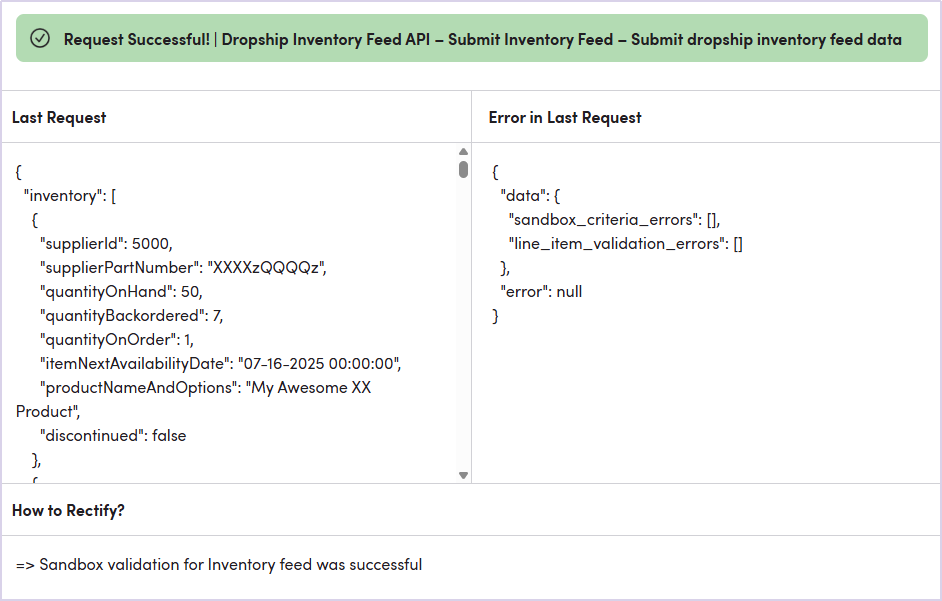 如下图所示一个成功的库存同步沙盒测试请求会触发绿色成功通知,表明提交的数据结构没问题。