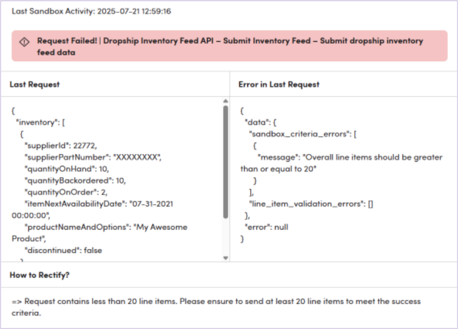 ⑥如果提供的沙盒测试有误,会在Sandbox Testing“ 页面显示红色提示。需要重新修改数据结构并提供正确参数(通过Postman等api调试工具)。